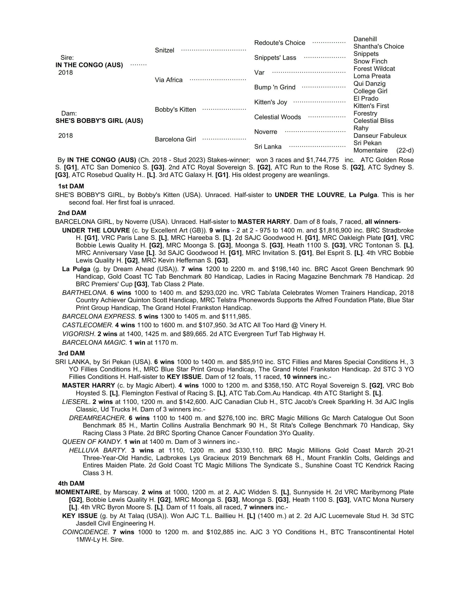 SHE’S BOBBY’S GIRL is also the only half-sister to Group 1 winner UNDER THE LOUVRE, a family that includes stakes performer LA PULGA, & multiple Saturday metropolitan winner BARTHELONA