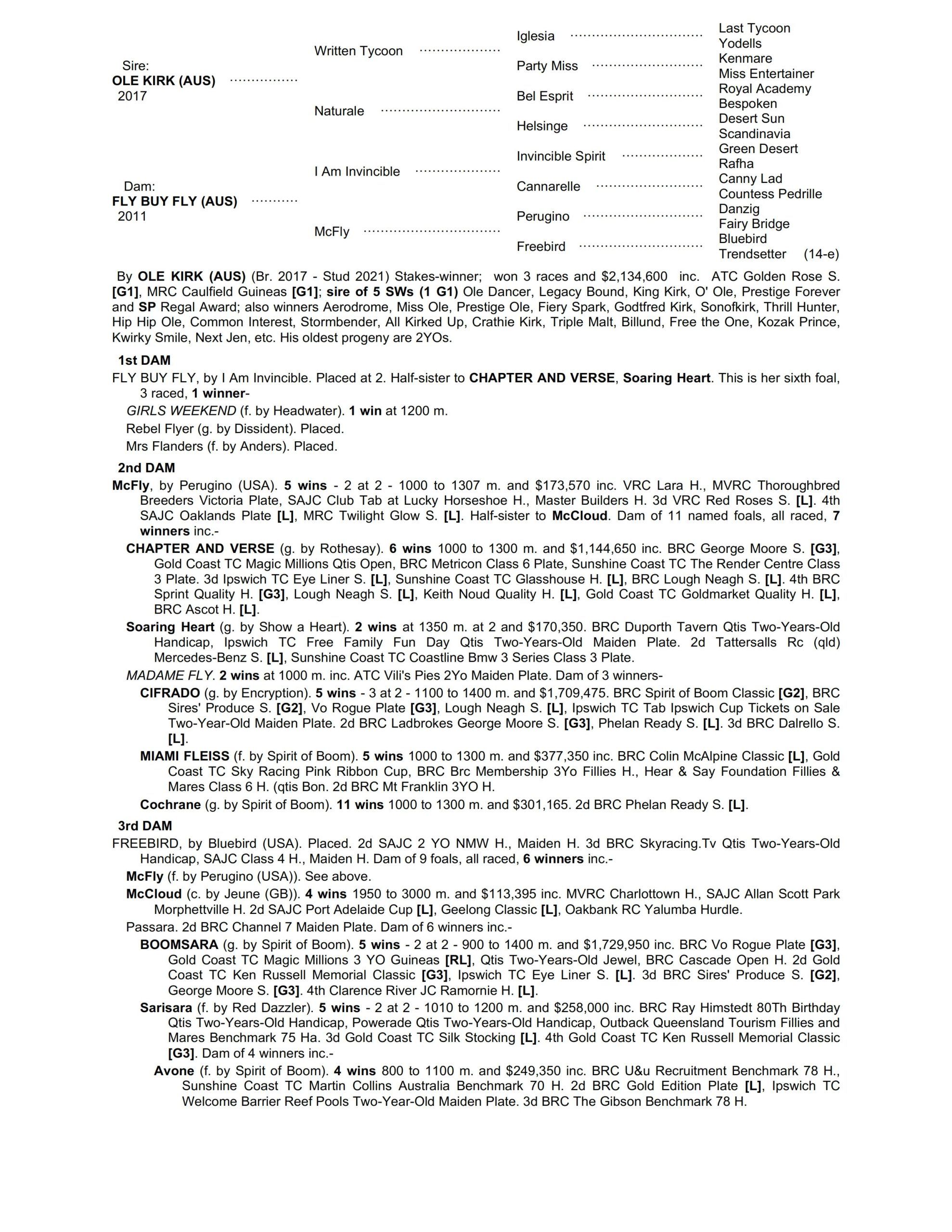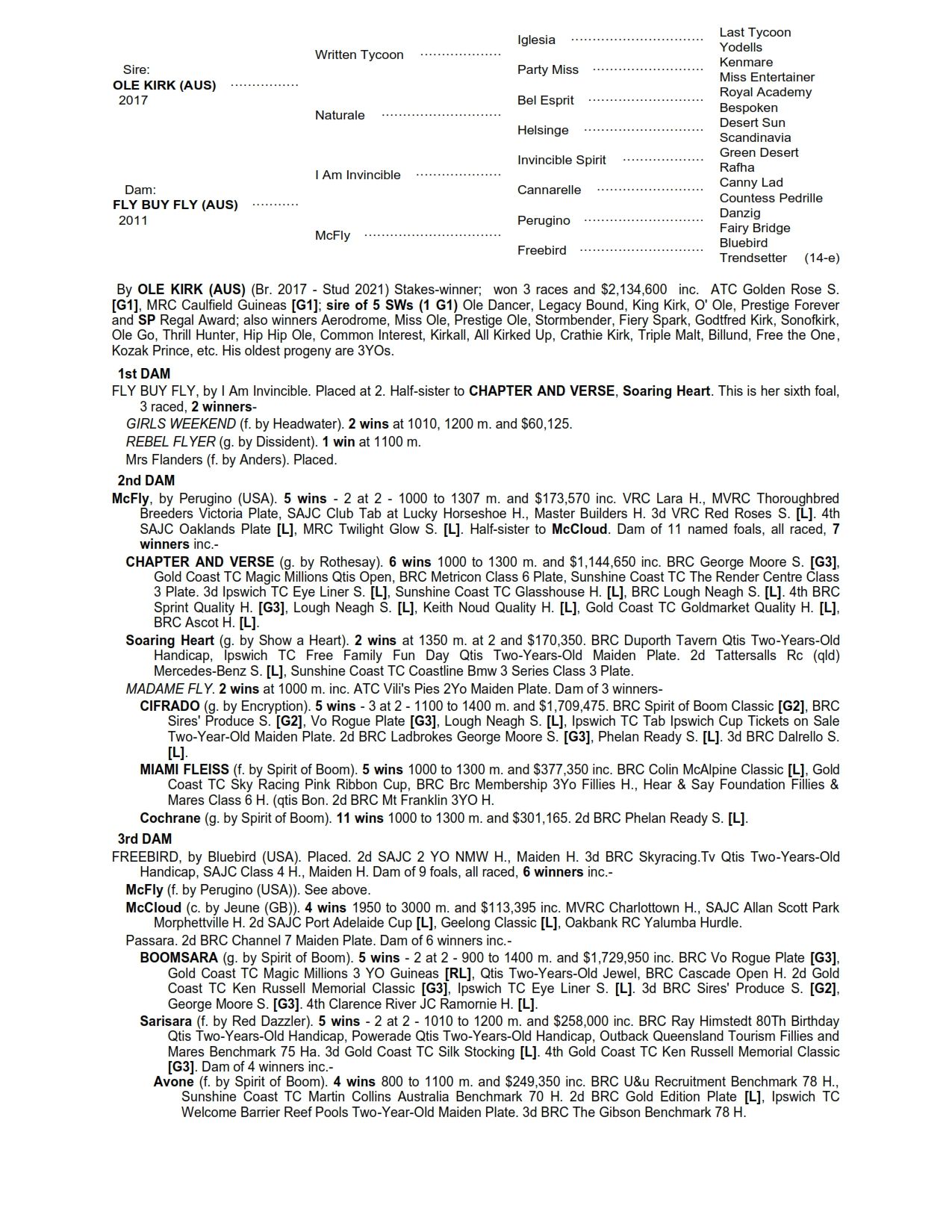 From the revered family of BLACK CAVIAR & ALL TOO HARD, OLE KIRK was the champion 3yo colt in Australia, winning the G1 Golden Rose & G1 Caulfield Guineas