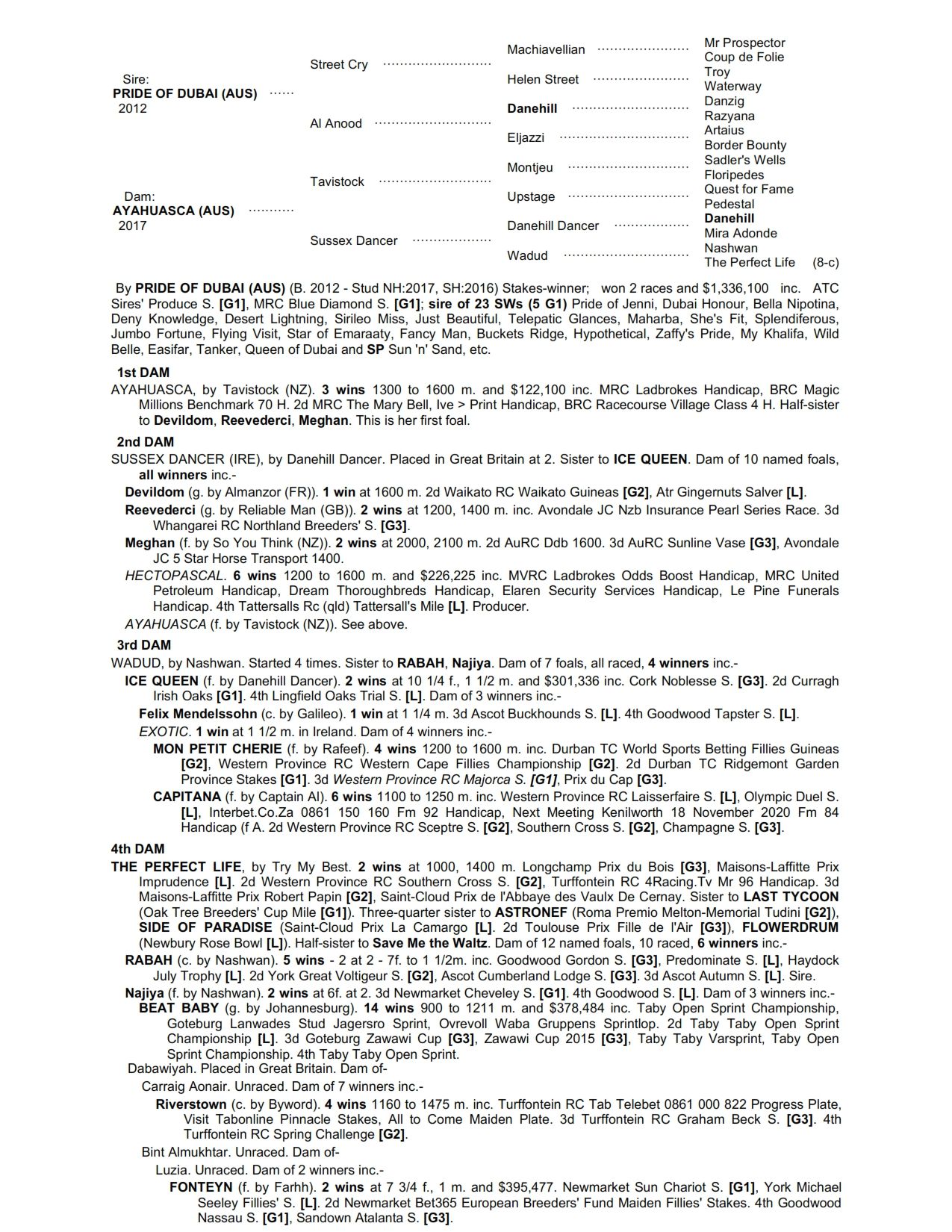 PRIDE OF DUBAI (dual Group 1 winning 2yo by STREET CRY) has sired 3 champion gallopers over a range of distances – BELLA NIPOTINA (sprinter), PRIDE OF JENNI (miler) & DUBAI HONOUR (stayer)