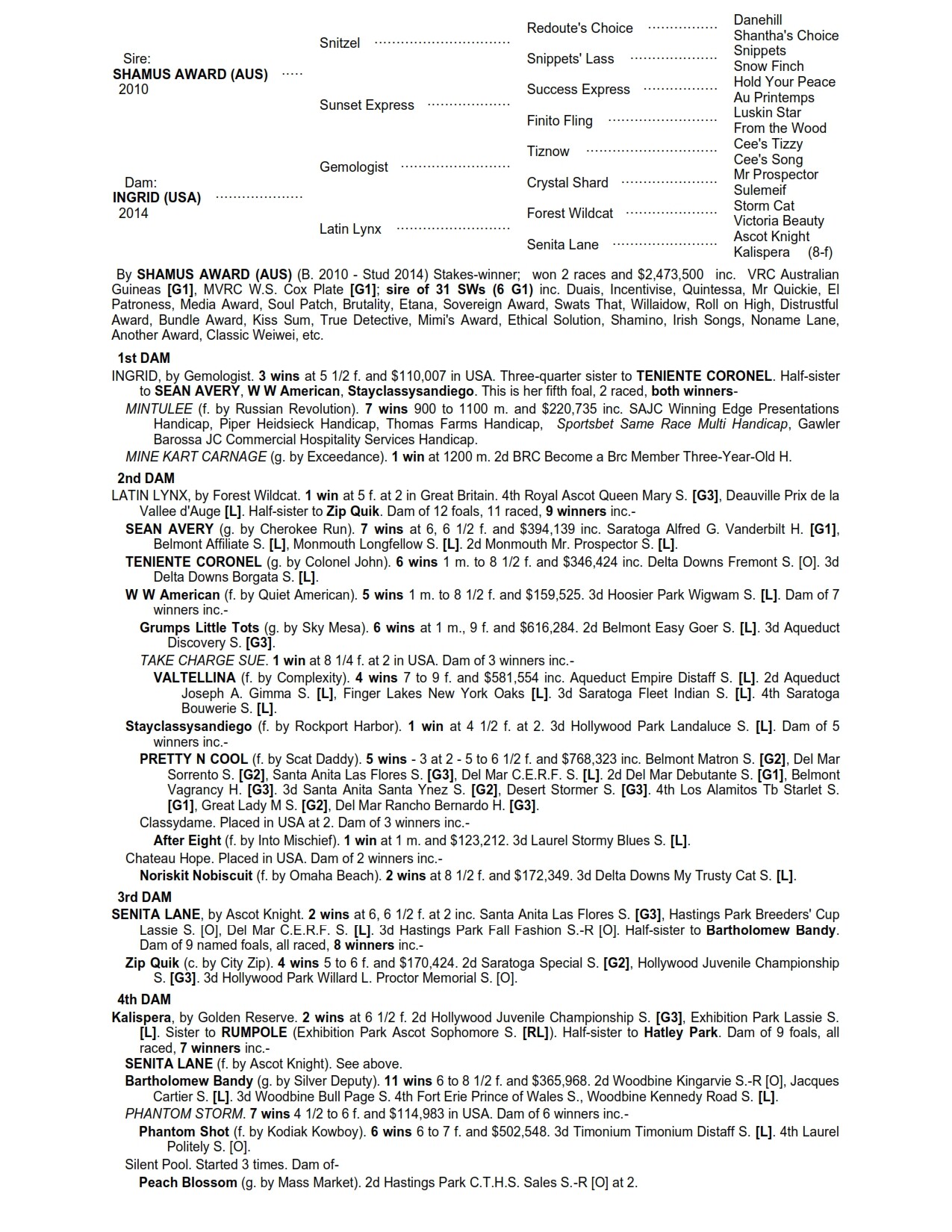 Line bred to STORM BIRD via STORM CAT & SNOW FINCH – the same pedigree pattern seen in SHAMUS AWARD’s 3 x Group 1 winner DUAIS & SNITZEL stallion IN THE CONGO