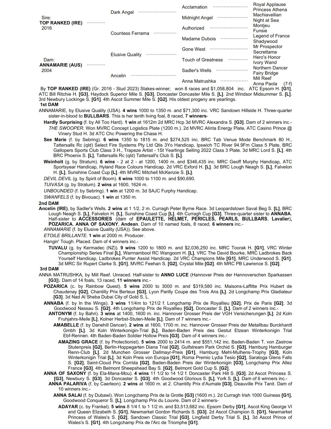Annamarie, a metropolitan winner, is also closely related to the best broodmare seen in Australasia this century in ACCESSORIES (dam of EPAULETTE, HELMET, PERICLES, BULLBARS, PEARLS, & LAVALIER)