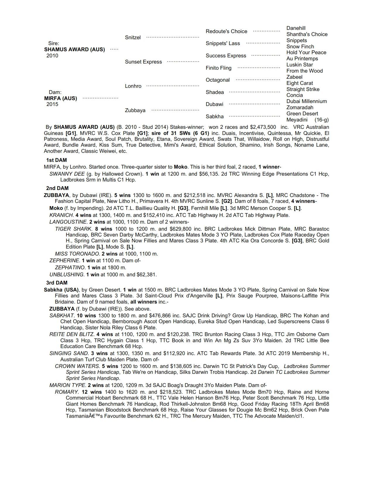 Lot 202 SHAMUS AWARD x MIRFA filly (Joe Pride)