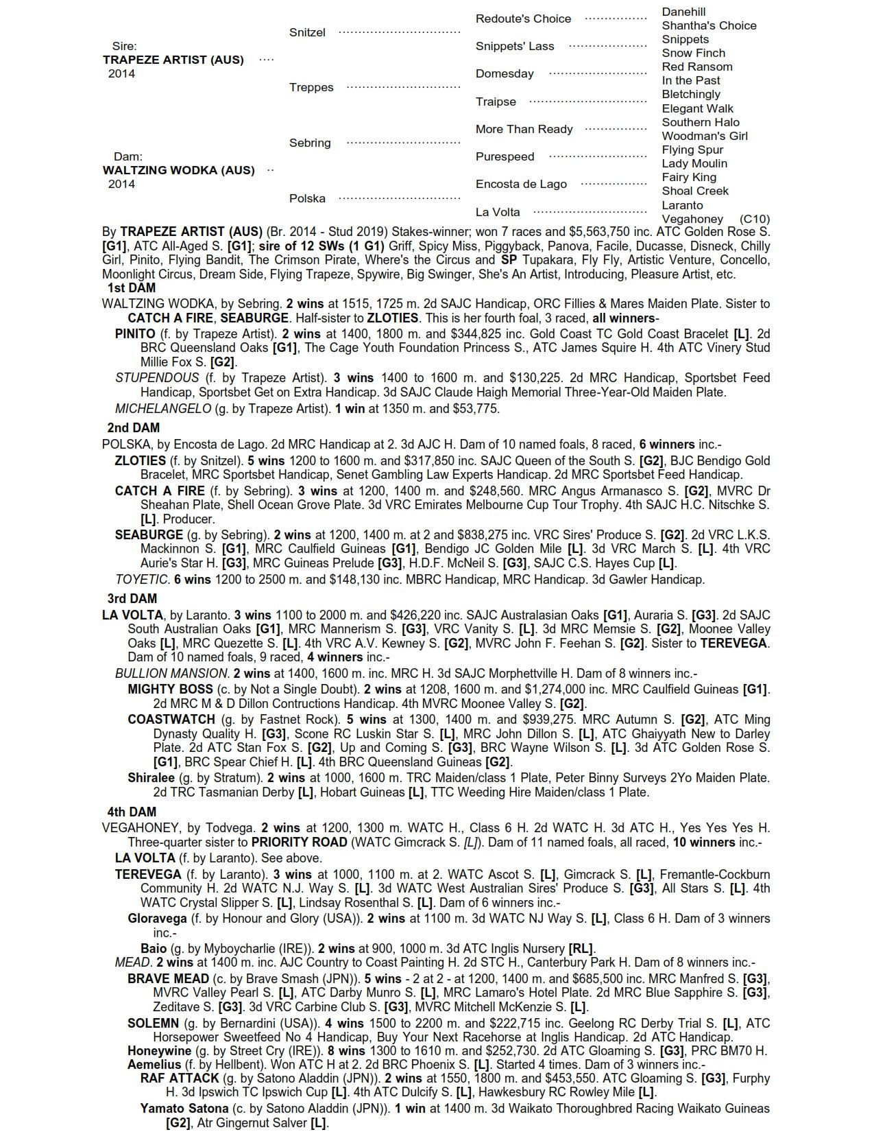 The most pertinent of our purchases is the TRAPEZE ARTIST x WALTZING WODKA filly, whose full-sister PINITO is one of the favourites to win the Group 3 Aspiration Quality (1600m) at Randwick this Saturday.