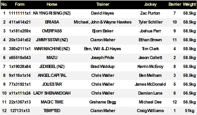 ANGEL CAPITAL got the draw he needed. He’s got enough ability to win an Everest but over-races and needs to find a bum quickly preferably without having to concede too much ground. He probably follows stablemates JOLIESTAR and LADY SHENANDOAH into the race. He’s got X-factor, we don’t know where the ceiling is yet with him.